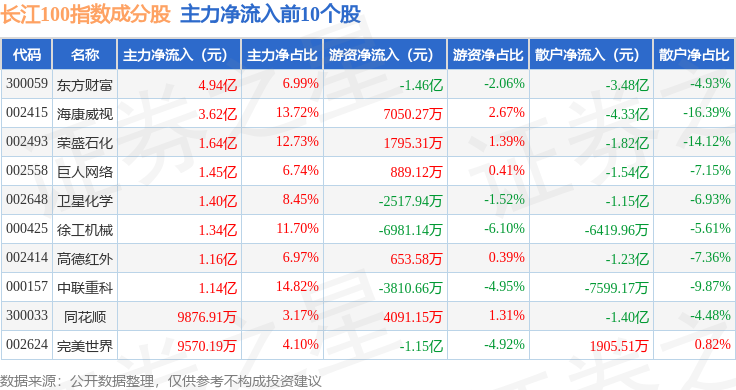 资金流向方面,长江100(399278)指数成份股当日主力资金净流出合计102.68亿元,游资资金净流入合计26.68亿元,散户资金净流入合计76.0亿元。成份股资金流向详情见下表: