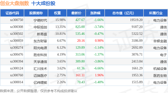 创业大盘(399293)指数十大成份股详情如下: