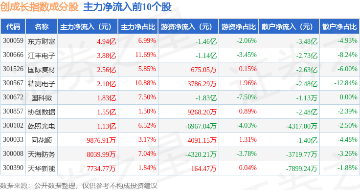 资金流向方面,创成长(399296)指数成份股当日主力资金净流出合计101.77亿元,游资资金净流入合计66.52亿元,散户资金净流入合计35.24亿元。成份股资金流向详情见下表: