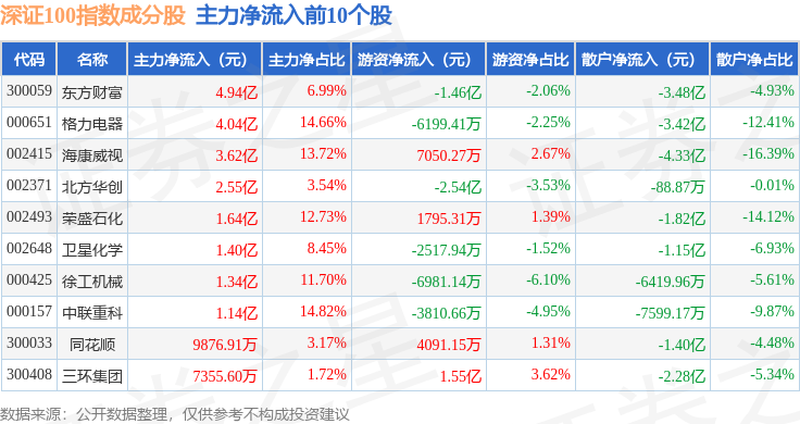 资金流向方面,深证100(399330)指数成份股当日主力资金净流出合计148.53亿元,游资资金净流入合计78.5亿元,散户资金净流入合计70.03亿元。成份股资金流向详情见下表: