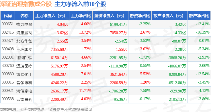 资金流向方面,深证治理(399328)指数成份股当日主力资金净流出合计52.86亿元,游资资金净流入合计26.49亿元,散户资金净流入合计26.37亿元。成份股资金流向详情见下表: