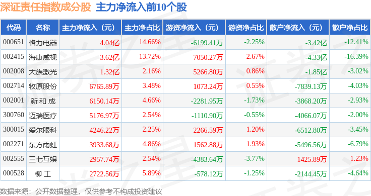 资金流向方面,深证责任(399341)指数成份股当日主力资金净流出合计55.42亿元,游资资金净流入合计23.29亿元,散户资金净流入合计32.13亿元。成份股资金流向详情见下表: