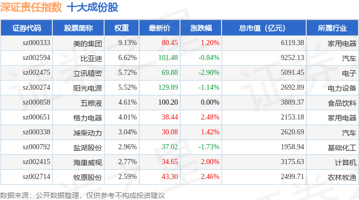 深证责任(399341)指数十大成份股详情如下: