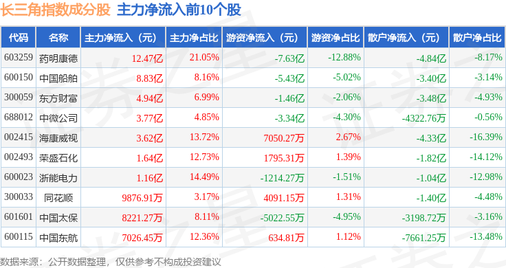 资金流向方面,长三角(399355)指数成份股当日主力资金净流入合计7.83亿元,游资资金净流出合计6.2亿元,散户资金净流出合计1.63亿元。成份股资金流向详情见下表: