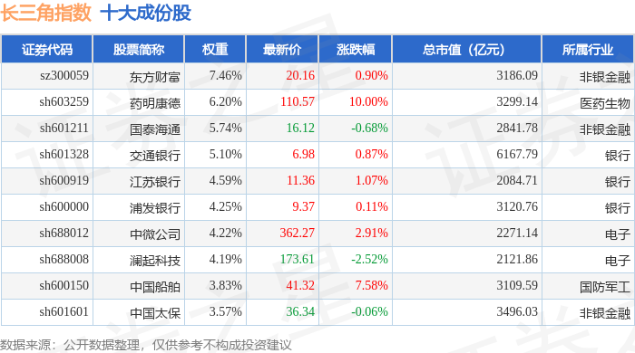 证券之星消息,4月28日,长三角(399355)指数报收于3672.88点,涨1.13%,成交884.15亿元,换手率0.73%。当日该指数成份股中,上涨的有23家,药明康德以10.0%的涨幅领涨,下跌的有15家,三花智控以3.81%的跌幅领跌。