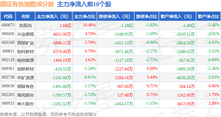资金流向方面,国证有色(399395)指数成份股当日主力资金净流出合计70.27亿元,游资资金净流入合计10.18亿元,散户资金净流入合计60.09亿元。成份股资金流向详情见下表:
