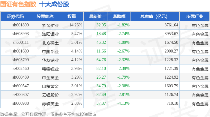 国证有色(399395)指数十大成份股详情如下: