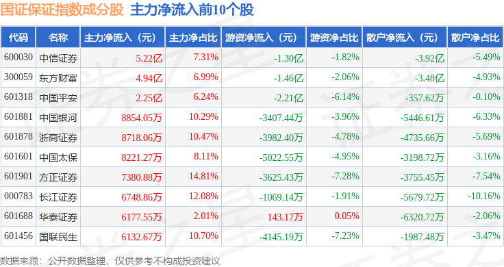 资金流向方面,国证保证(399420)指数成份股当日主力资金净流入合计14.42亿元,游资资金净流出合计6.09亿元,散户资金净流出合计8.32亿元。成份股资金流向详情见下表: