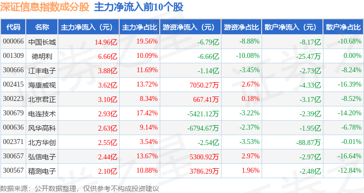 资金流向方面,深证信息(399620)指数成份股当日主力资金净流出合计103.77亿元,游资资金净流入合计22.08亿元,散户资金净流入合计81.69亿元。成份股资金流向详情见下表: