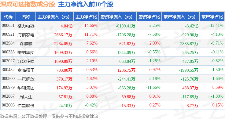 资金流向方面,深成可选(399683)指数成份股当日主力资金净流出合计34.8亿元,游资资金净流入合计3.99亿元,散户资金净流入合计30.8亿元。成份股资金流向详情见下表:
