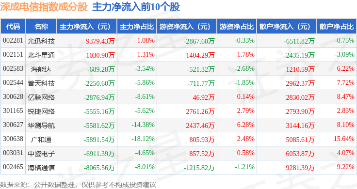 资金流向方面,深成电信(399688)指数成份股当日主力资金净流出合计72.15亿元,游资资金净流入合计45.52亿元,散户资金净流入合计26.63亿元。成份股资金流向详情见下表: