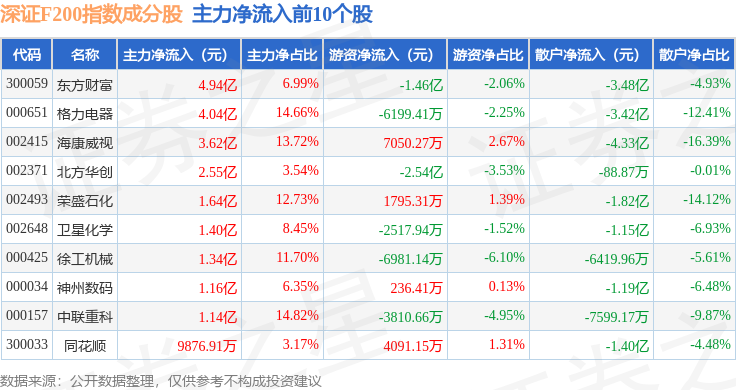 资金流向方面,深证F200(399703)指数成份股当日主力资金净流出合计137.53亿元,游资资金净流入合计70.9亿元,散户资金净流入合计66.64亿元。成份股资金流向详情见下表: