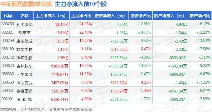 资金流向方面,中证医药(399933)指数成份股当日主力资金净流入合计19.96亿元,游资资金净流出合计8.66亿元,散户资金净流出合计11.31亿元。成份股资金流向详情见下表: