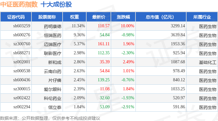 中证医药(399933)指数十大成份股详情如下: