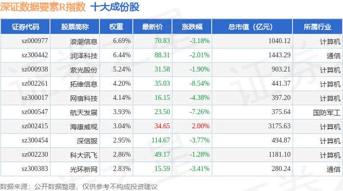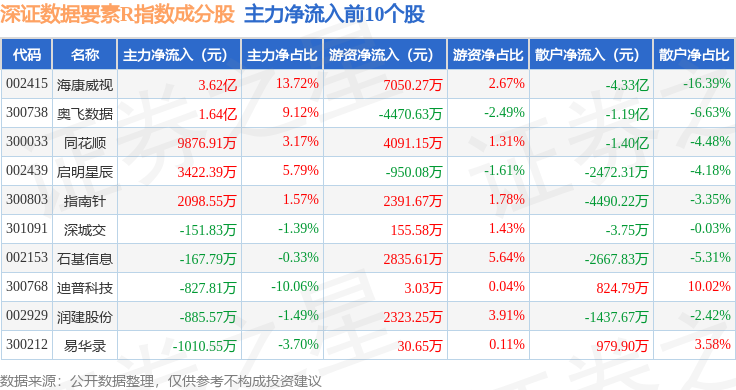 资金流向方面,深证数据要素R(470053)指数成份股当日主力资金净流出合计53.9亿元,游资资金净流入合计13.39亿元,散户资金净流入合计40.51亿元。成份股资金流向详情见下表:
