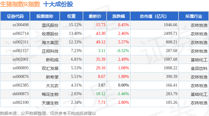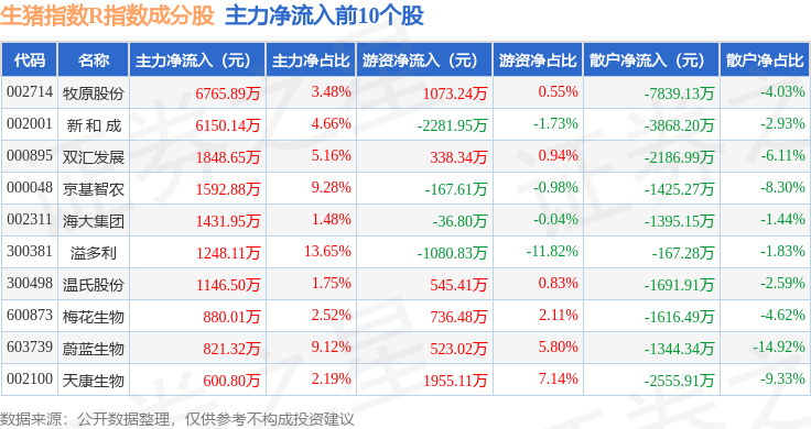 资金流向方面,生猪指数R(480073)指数成份股当日主力资金净流入合计1472.22万元,游资资金净流入合计1.96亿元,散户资金净流出合计2.11亿元。成份股资金流向详情见下表: