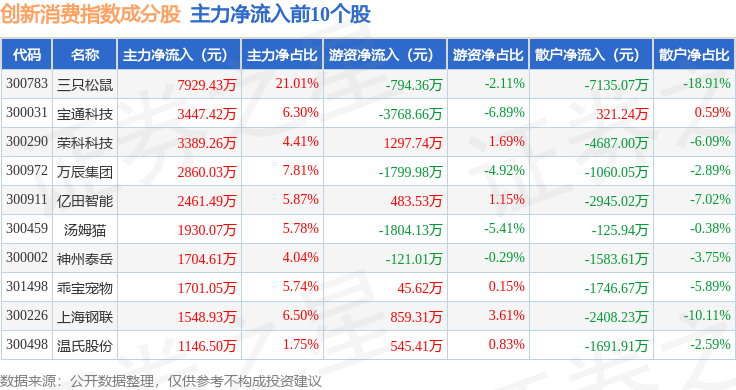 资金流向方面,创新消费(970041)指数成份股当日主力资金净流出合计18.46亿元,游资资金净流入合计1.77亿元,散户资金净流入合计16.69亿元。成份股资金流向详情见下表: