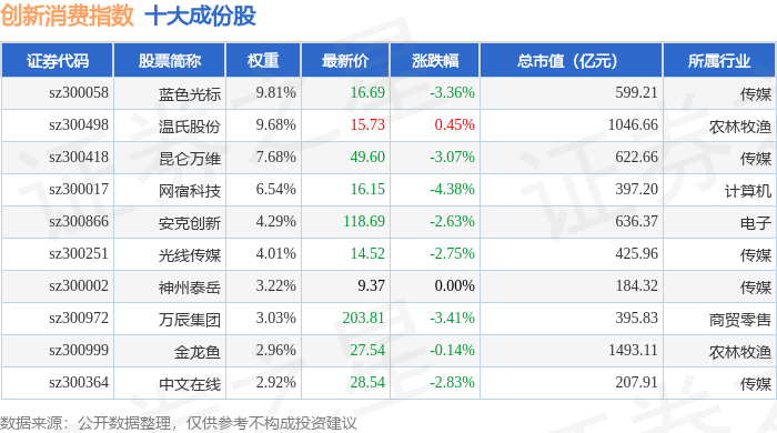 创新消费(970041)指数十大成份股详情如下: