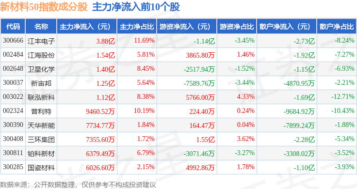 资金流向方面,新材料50(970042)指数成份股当日主力资金净流出合计42.99亿元,游资资金净流入合计21.87亿元,散户资金净流入合计21.12亿元。成份股资金流向详情见下表: