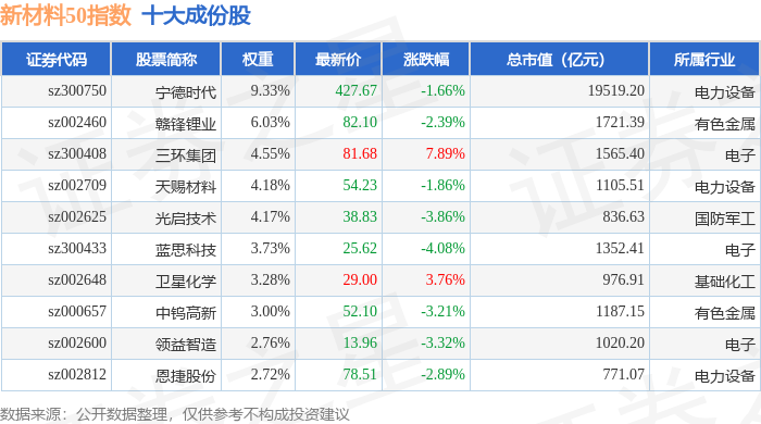 新材料50(970042)指数十大成份股详情如下: