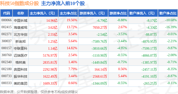 资金流向方面,科技50(970080)指数成份股当日主力资金净流出合计63.41亿元,游资资金净流入合计21.89亿元,散户资金净流入合计41.52亿元。成份股资金流向详情见下表:
