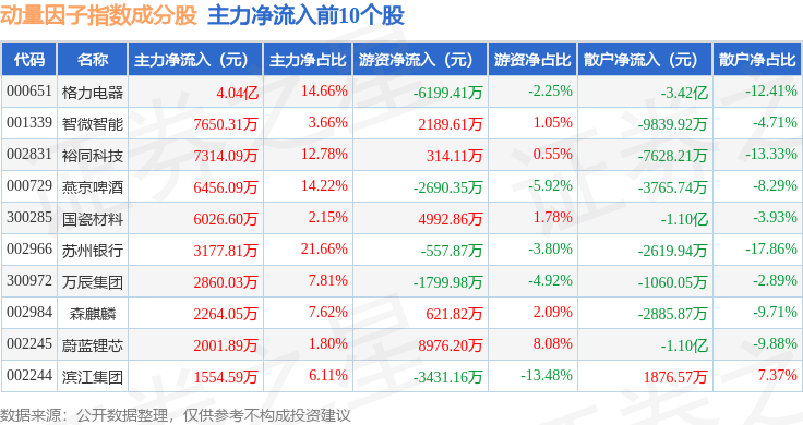资金流向方面,动量因子(980057)指数成份股当日主力资金净流出合计1.31亿元,游资资金净流入合计6.24亿元,散户资金净流出合计4.94亿元。成份股资金流向详情见下表: