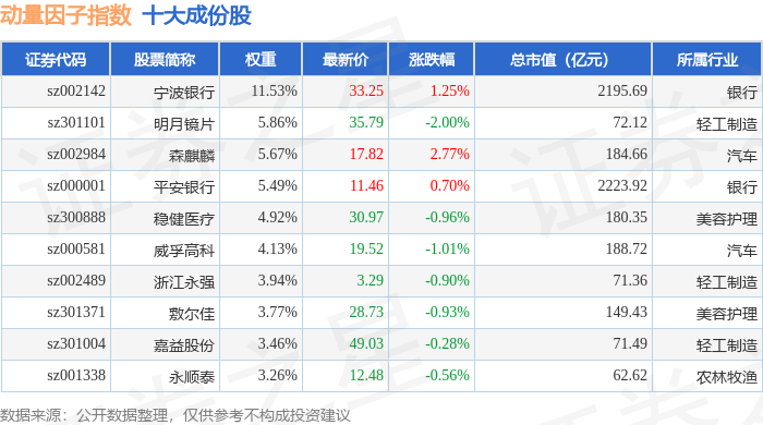 证券之星消息,4月28日,动量因子(980057)指数报收于2397.03点,涨0.13%,成交267.31亿元,换手率1.45%。当日该指数成份股中,上涨的有22家,智微智能以6.47%的涨幅领涨,下跌的有27家,肇民科技以8.42%的跌幅领跌。
