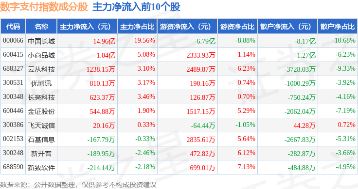 资金流向方面,数字支付(980113)指数成份股当日主力资金净流入合计2075.27万元,游资资金净流出合计1.77亿元,散户资金净流入合计1.39亿元。成份股资金流向详情见下表:
