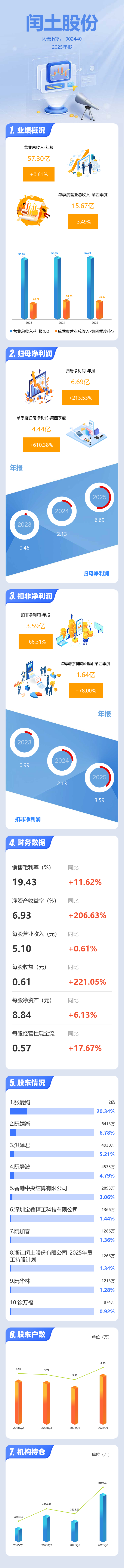 证券之星消息,闰土股份2025年年报显示,当年度公司主营收入57.3亿元,同比上升0.61%;归母净利润6.69亿元,同比上升213.54%;扣非净利润3.59亿元,同比上升68.32%;其中2025年第四季度,公司单季度主营收入15.67亿元,同比下降3.5%;单季度归母净利润4.44亿元,同比上升610.39%;单季度扣非净利润1.64亿元,同比上升78.0%;负债率11.81%,投资收益3.09亿元,财务费用-508.04万元,毛利率19.43%。