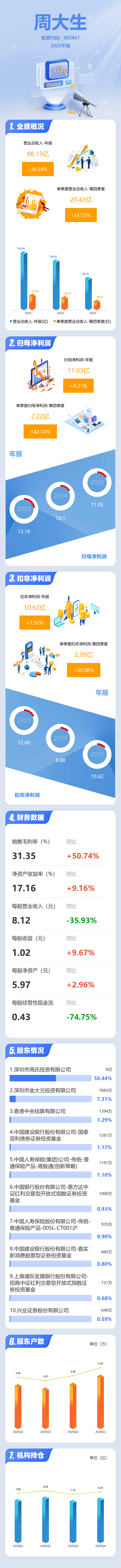 证券之星消息,周大生2025年年报显示,当年度公司主营收入88.15亿元,同比下降36.54%;归母净利润11.03亿元,同比上升9.22%;扣非净利润10.62亿元,同比上升7.52%;其中2025年第四季度,公司单季度主营收入20.43亿元,同比下降33.72%;单季度归母净利润2.22亿元,同比上升42.75%;单季度扣非净利润2.09亿元,同比上升39.08%;负债率22.08%,投资收益-2802.2万元,财务费用1328.33万元,毛利率31.35%。