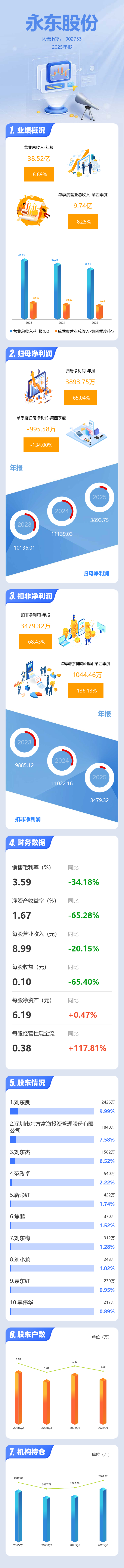 证券之星消息,永东股份2025年年报显示,当年度公司主营收入38.52亿元,同比下降8.89%;归母净利润3893.75万元,同比下降65.04%;扣非净利润3479.32万元,同比下降68.43%;其中2025年第四季度,公司单季度主营收入9.74亿元,同比下降8.25%;单季度归母净利润-995.58万元,同比下降134.01%;单季度扣非净利润-1044.46万元,同比下降136.14%;负债率28.66%,投资收益575.79万元,财务费用3096.39万元,毛利率3.59%。