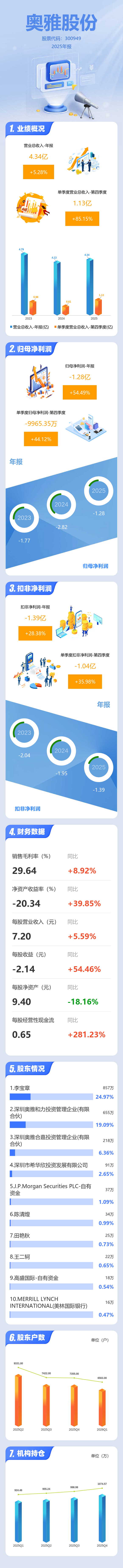 证券之星消息,奥雅股份2025年年报显示,当年度公司主营收入4.34亿元,同比上升5.29%;归母净利润-1.28亿元,同比上升54.5%;扣非净利润-1.39亿元,同比上升28.39%;其中2025年第四季度,公司单季度主营收入1.13亿元,同比上升85.15%;单季度归母净利润-9965.35万元,同比上升44.12%;单季度扣非净利润-1.04亿元,同比上升35.99%;负债率45.21%,投资收益36.72万元,财务费用-83.37万元,毛利率29.64%。