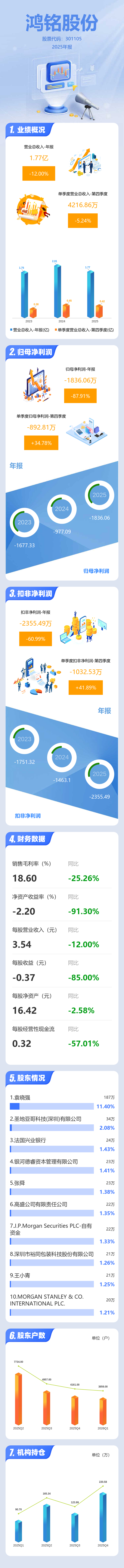 证券之星消息,鸿铭股份2025年年报显示,当年度公司主营收入1.77亿元,同比下降12.01%;归母净利润-1836.06万元,同比下降87.91%;扣非净利润-2355.49万元,同比下降60.99%;其中2025年第四季度,公司单季度主营收入4216.86万元,同比下降5.25%;单季度归母净利润-892.81万元,同比上升34.78%;单季度扣非净利润-1032.53万元,同比上升41.89%;负债率11.11%,投资收益448.11万元,财务费用-110.51万元,毛利率18.6%。