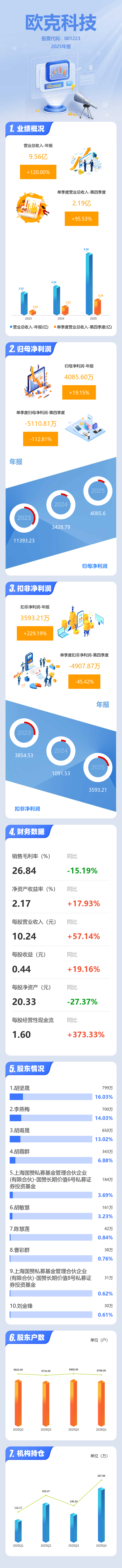 证券之星消息,欧克科技2025年年报显示,当年度公司主营收入9.56亿元,同比上升120.01%;归母净利润4085.6万元,同比上升19.16%;扣非净利润3593.21万元,同比上升229.19%;其中2025年第四季度,公司单季度主营收入2.19亿元,同比上升95.54%;单季度归母净利润-5110.81万元,同比下降112.81%;单季度扣非净利润-4907.87万元,同比下降45.43%;负债率20.36%,投资收益-70.71万元,财务费用132.61万元,毛利率26.84%。