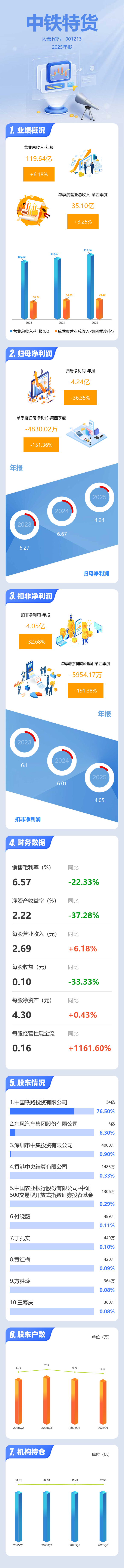 证券之星消息,中铁特货2025年年报显示,当年度公司主营收入119.64亿元,同比上升6.18%;归母净利润4.24亿元,同比下降36.36%;扣非净利润4.05亿元,同比下降32.69%;其中2025年第四季度,公司单季度主营收入35.1亿元,同比上升3.25%;单季度归母净利润-4830.02万元,同比下降151.36%;单季度扣非净利润-5954.17万元,同比下降191.39%;负债率10.55%,投资收益2417.49万元,财务费用-5015.7万元,毛利率6.57%。