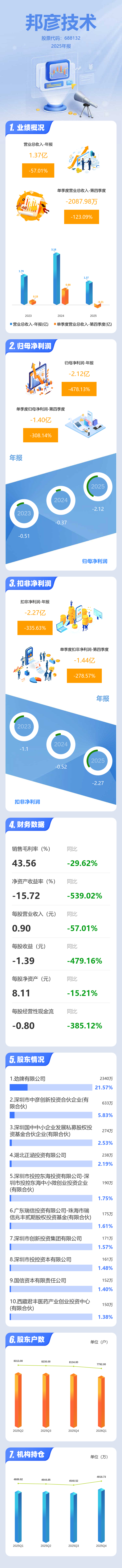 证券之星消息,邦彦技术2025年年报显示,当年度公司主营收入1.37亿元,同比下降57.01%;归母净利润-2.12亿元,同比下降478.13%;扣非净利润-2.27亿元,同比下降335.63%;其中2025年第四季度,公司单季度主营收入-2087.98万元,同比下降123.1%;单季度归母净利润-1.4亿元,同比下降308.14%;单季度扣非净利润-1.44亿元,同比下降278.58%;负债率20.13%,投资收益143.34万元,财务费用25.69万元,毛利率43.56%。
