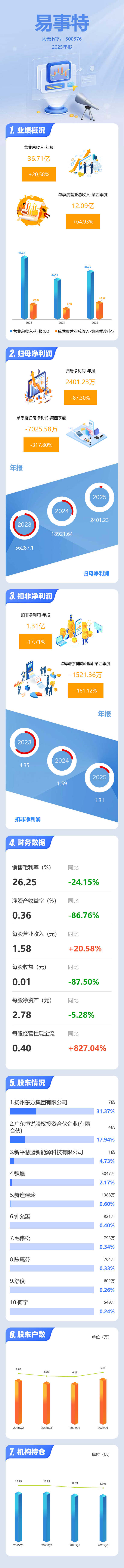 证券之星消息,易事特2025年年报显示,当年度公司主营收入36.71亿元,同比上升20.59%;归母净利润2401.23万元,同比下降87.31%;扣非净利润1.31亿元,同比下降17.72%;其中2025年第四季度,公司单季度主营收入12.09亿元,同比上升64.93%;单季度归母净利润-7025.58万元,同比下降317.81%;单季度扣非净利润-1521.36万元,同比下降181.12%;负债率49.29%,投资收益-7.1万元,财务费用6891.52万元,毛利率26.25%。