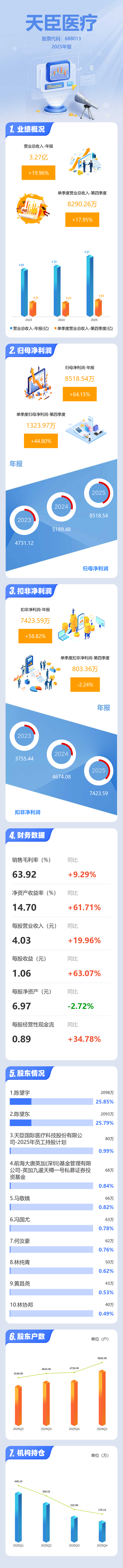 证券之星消息,天臣医疗2025年年报显示,当年度公司主营收入3.27亿元,同比上升19.96%;归母净利润8518.54万元,同比上升64.15%;扣非净利润7423.59万元,同比上升58.82%;其中2025年第四季度,公司单季度主营收入8290.26万元,同比上升17.96%;单季度归母净利润1323.97万元,同比上升44.8%;单季度扣非净利润803.36万元,同比下降2.24%;负债率15.96%,投资收益276.81万元,财务费用-1012.97万元,毛利率63.92%。