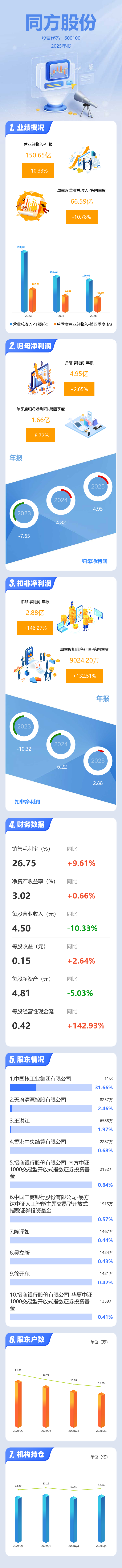 证券之星消息,同方股份2025年年报显示,当年度公司主营收入150.65亿元,同比下降10.34%;归母净利润4.95亿元,同比上升2.66%;扣非净利润2.88亿元,同比上升146.27%;其中2025年第四季度,公司单季度主营收入66.59亿元,同比下降10.78%;单季度归母净利润1.66亿元,同比下降8.72%;单季度扣非净利润9024.2万元,同比上升132.51%;负债率57.92%,投资收益7.64亿元,财务费用3.37亿元,毛利率26.75%。