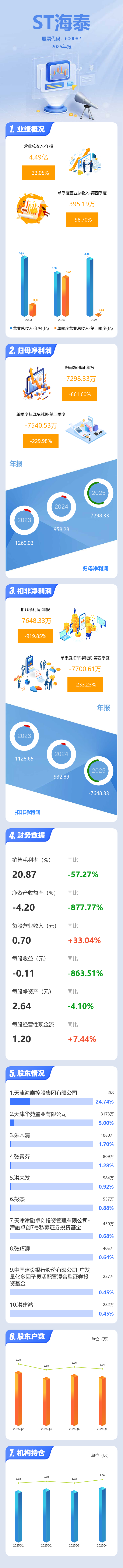证券之星消息,ST海泰2025年年报显示,当年度公司主营收入4.49亿元,同比上升33.06%;归母净利润-7298.33万元,同比下降861.61%;扣非净利润-7648.33万元,同比下降919.85%;其中2025年第四季度,公司单季度主营收入395.19万元,同比下降98.7%;单季度归母净利润-7540.53万元,同比下降229.98%;单季度扣非净利润-7700.61万元,同比下降233.24%;负债率32.07%,投资收益121.84万元,财务费用4317.58万元,毛利率20.87%。