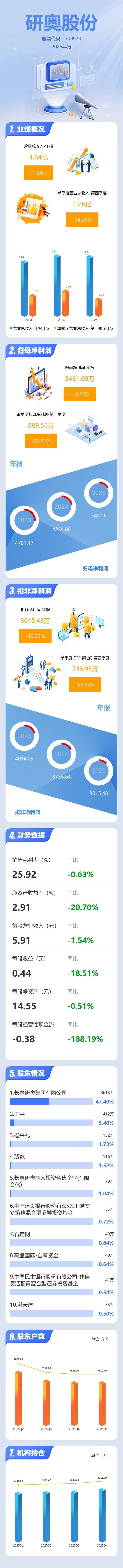 证券之星消息,研奥股份2025年年报显示,当年度公司主营收入4.64亿元,同比下降1.54%;归母净利润3461.6万元,同比下降18.26%;扣非净利润3015.48万元,同比下降19.3%;其中2025年第四季度,公司单季度主营收入1.26亿元,同比下降34.26%;单季度归母净利润889.55万元,同比下降62.21%;单季度扣非净利润748.93万元,同比下降66.32%;负债率13.99%,投资收益264.56万元,财务费用-20.8万元,毛利率25.92%。