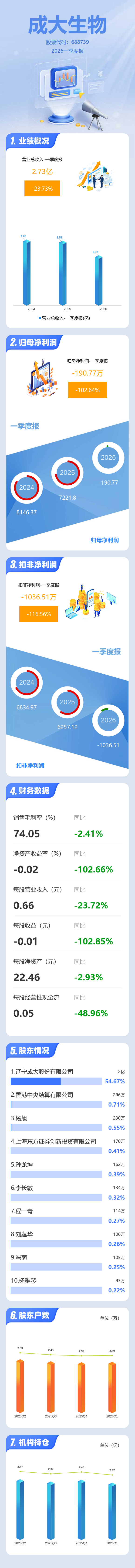 证券之星消息,成大生物2026年一季报显示,一季度公司主营收入2.73亿元,同比下降23.73%;归母净利润-190.77万元,同比下降102.64%;扣非净利润-1036.51万元,同比下降116.57%;负债率3.34%,投资收益742.29万元,财务费用-317.93万元,毛利率74.05%。