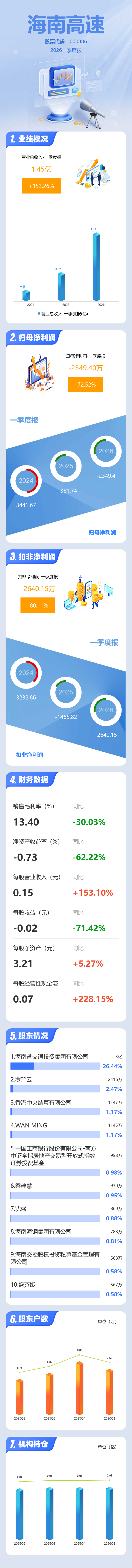 证券之星消息,海南高速2026年一季报显示,一季度公司主营收入1.45亿元,同比上升153.27%;归母净利润-2349.4万元,同比下降72.53%;扣非净利润-2640.15万元,同比下降80.11%;负债率26.01%,投资收益-1070.19万元,财务费用435.45万元,毛利率13.4%。