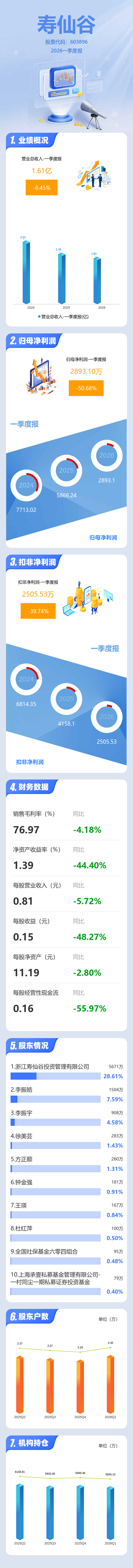 证券之星消息,寿仙谷2026年一季报显示,一季度公司主营收入1.61亿元,同比下降8.46%;归母净利润2893.1万元,同比下降50.68%;扣非净利润2505.53万元,同比下降39.74%;负债率28.82%,投资收益3.04万元,财务费用400.69万元,毛利率76.97%。