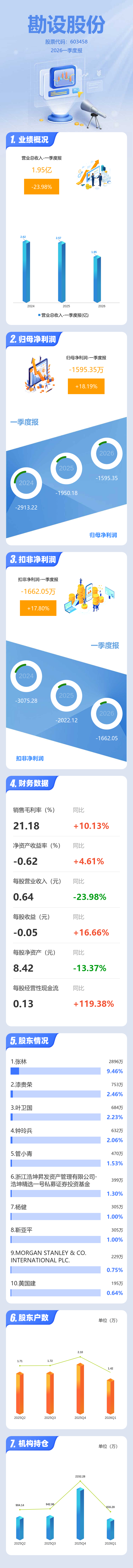 证券之星消息,勘设股份2026年一季报显示,一季度公司主营收入1.95亿元,同比下降23.98%;归母净利润-1595.35万元,同比上升18.2%;扣非净利润-1662.05万元,同比上升17.81%;负债率47.93%,投资收益274.79万元,财务费用892.97万元,毛利率21.18%。
