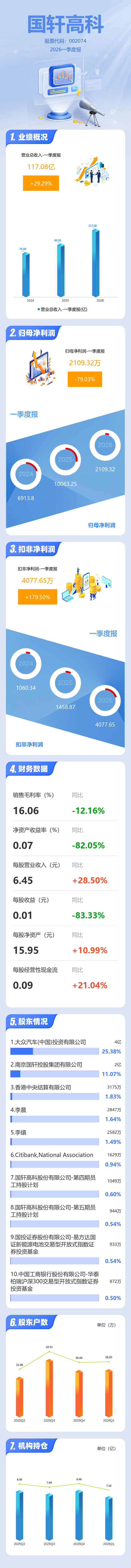 证券之星消息,国轩高科2026年一季报显示,一季度公司主营收入117.08亿元,同比上升29.3%;归母净利润2109.32万元,同比下降79.04%;扣非净利润4077.65万元,同比上升179.51%;负债率71.97%,投资收益-182.59万元,财务费用5.82亿元,毛利率16.06%。