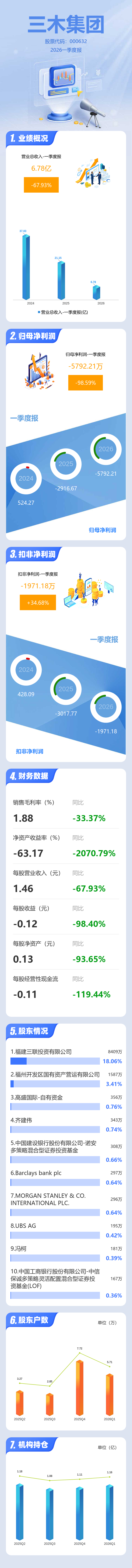 证券之星消息,三木集团2026年一季报显示,一季度公司主营收入6.78亿元,同比下降67.94%;归母净利润-5792.21万元,同比下降98.59%;扣非净利润-1971.18万元,同比上升34.68%;负债率94.65%,投资收益12.78万元,财务费用3227.55万元,毛利率1.88%。