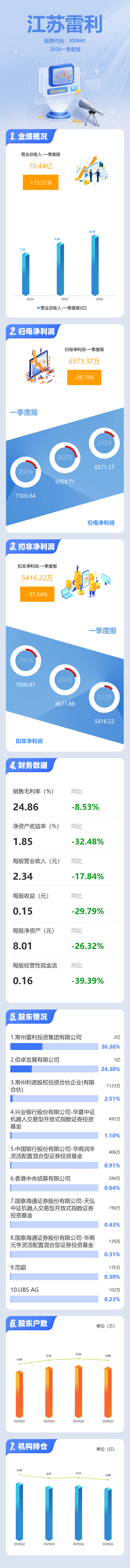 证券之星消息,江苏雷利2026年一季报显示,一季度公司主营收入10.44亿元,同比上升15.01%;归母净利润6571.37万元,同比下降29.79%;扣非净利润5416.22万元,同比下降37.54%;负债率42.36%,投资收益402.21万元,财务费用2341.15万元,毛利率24.86%。