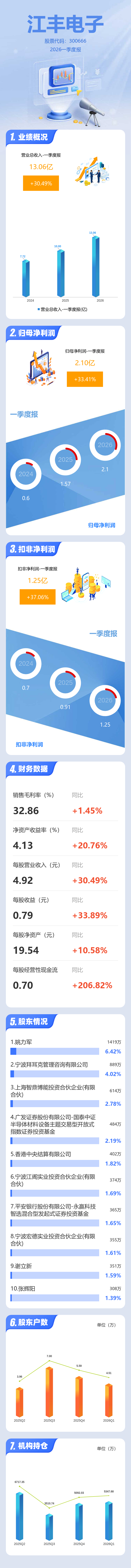 证券之星消息,江丰电子2026年一季报显示,一季度公司主营收入13.06亿元,同比上升30.49%;归母净利润2.1亿元,同比上升33.42%;扣非净利润1.25亿元,同比上升37.07%;负债率57.69%,投资收益9204.21万元,财务费用3077.79万元,毛利率32.86%。
