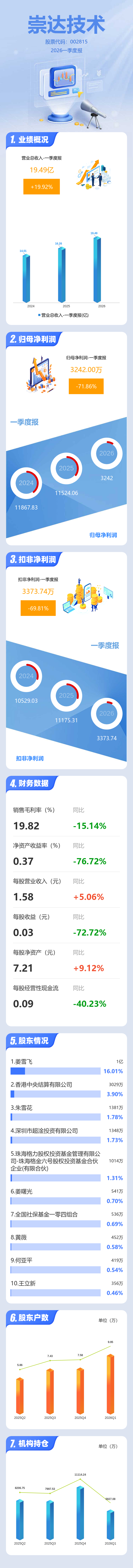 证券之星消息,崇达技术2026年一季报显示,一季度公司主营收入19.49亿元,同比上升19.92%;归母净利润3242.0万元,同比下降71.87%;扣非净利润3373.74万元,同比下降69.81%;负债率25.13%,投资收益359.99万元,财务费用2422.89万元,毛利率19.82%。